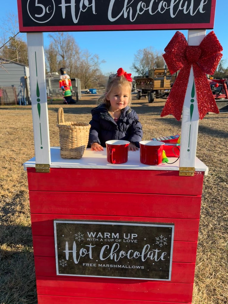 At every turn at Agape Farm, they have numerous photo opportunities, whether it’s feeding the animals, catching and holding a chicken, sending a letter to Santa, pouring hot cocoa at the hot chocolate stand, riding in the giant wagon, or hopping in the little one with an adorable tree tied on top, they have several spots to snap the cutest pic of your little ones.